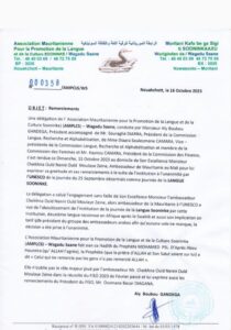 L’Association Mauritanienne pour la promotion de la langue et de la culture Soninké (AMPLCS) a adressé ses remerciements à SEM l’ambassadeur Cheikhna Ould Nenni Ould Moulaye Zeine pour le rôle qu’il a joué dans « l’institution à l’unanimité par l’Unesco de la journée du 25 septembre Journée de la langue SOONINKE. »
